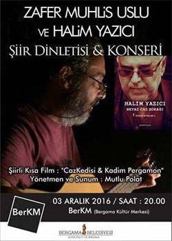 Bergama temalı şiirlerini seslendirecek olan şair Halim Yazıcı’ya, müzisyen Zafer Muhlis Uslu’nun, yine şairin şiirlerinden bestelediği ve geçtiğimiz ay piyasaya çıkan “Bu Seferlik Affedin” adlı CD’sinde yer verdiği bestelerini seslendirecek