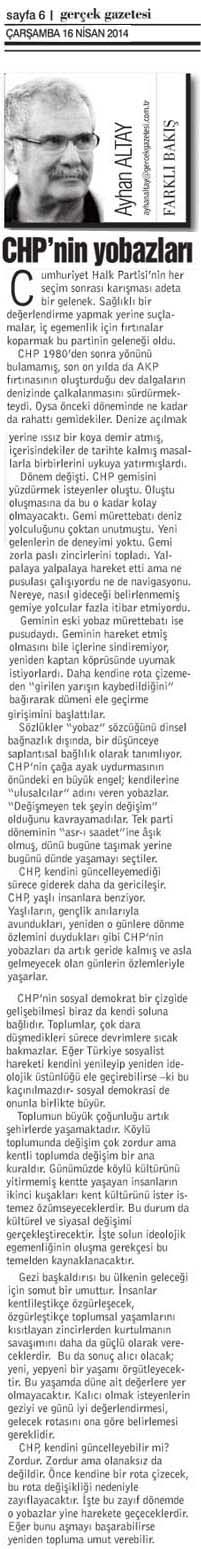 CHP, kendini güncelleyebilir mi? Zordur. Zordur ama olanaksız da değildir. Önce kendine bir rota çizecek, bu rota değişikliği nedeniyle zayıflayacaktır. İşte bu zayıf dönemde o yobazlar yine harekete geçeceklerdir. Eğer bunu aşmayı başarabilirse yeniden topluma umut verebilir.